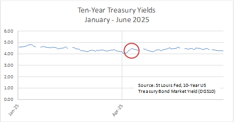 Volatility is not necessarily a sign of market dysfunction. More often, it reflects market reaction to important changes in economic information. In the case of the bond market, interest rate increases can reflect concerns about the likely performance of the economy. The largest increase this year followed closely on President Trump’s tariff announcement on April 2. In the event, rates in the three months after the large increase (circled in orange) stayed in the same range as earlier in the year.