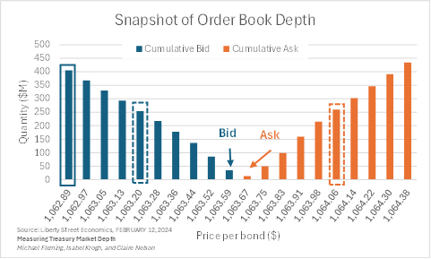 - The chart illustrates “depth” – one measure of liquidity. Suppose a new seller arrives in the market and wants to sell $400M worth of bonds (about 400,000 bonds at $1,000 per bond). That seller would have to accept a price of $1,062.89 for their bonds (blue solid box), a price decline of 10 ticks or $.78 per bond, or .07%. If an individual seller had wanted to sell $100,000 worth of bonds, the price might have changed 1 tick, or .007% – practically no change at all.